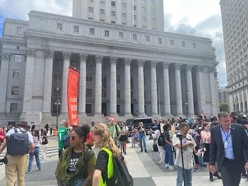 Upon our initial arrival at the Civic Center, at around 1 pm, there were only a few student groups. The event started at 2 pm, and those who came in early attendance were adult organizers, journalists, and reporters beginning to stage the scene. There were several boxes filled with t-shirts, flyers, and snacks. It was clear that the organizers arrived with protest experience. The reporters had large cameras with equipment that effectively cost near the thousands. As more attendees gathered around, people took part in interviews. Many students asked for participation in their podcasts. One student from Ghana openly expressed her frustrations, having come from a part of the world where extreme heat was standard, and compared it to the changing conditions of New York.