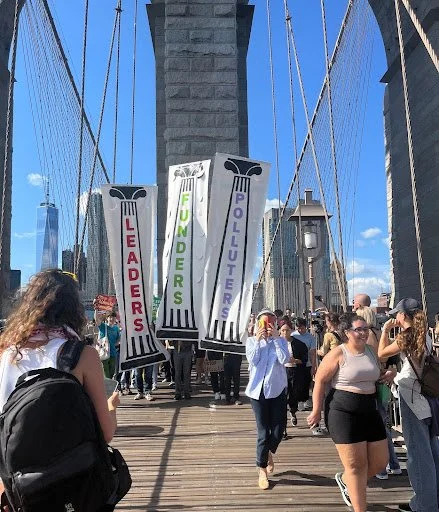 Protests slowly began to walk southeast toward the Brooklyn Bridge walkway. Immediately, chants began as people fell into the marching lines. Christina Torres, our teaching assistant, mentioned to the class that many organizers create a marching structure that falls into waves. There is a front line that creates the direction needed for the protestors to follow. At the beginning of the march, there was a large banner from a group reading “Tear Down Fossil Fuels.” This banner provided context for which the rest of the march represented. People wore brightly colored neon safety vests, guiding the marchers along the path. Some rode bicycles to stop traffic, while others ensured the protesters did not spread too far in the street. Safety measures provided safety not only for the protestors but also for bystanders.